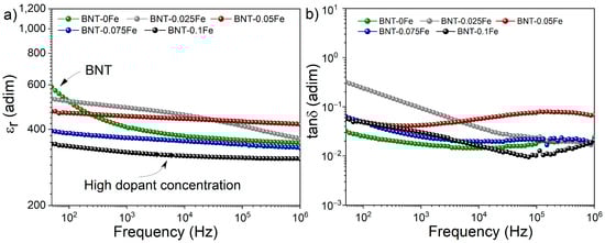 The effect of iron on the relative permittivity (εr) and tan δ versus the frequency of BNT at room temperature is shown in Figure 5a. As can be seen, the iron-free sample reveals an initial εr of 600; however, as the frequency increases, this value drops abruptly, remaining almost horizontal around 450 at frequencies above 10⁴ Hz. This phenomenon is associated with the interfacial polarization mechanism, where the primary contributors to polarization at low frequencies are volumetric and surface defects, such as porosity observed in Figure 2. These defects can act as pinning centers for electric charges, thereby limiting their mobility and contributing to the overall εr. In this context, although the εr value might seem relatively high, it does not reflect the inherent polarization of the BNT material at low frequencies.