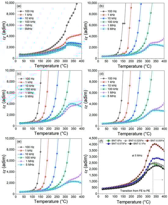 The temperature dependence of the relative dielectric permittivity (εr) and the loss tangent (tan δ) for BNT-xFe ceramics at various frequencies (100 Hz, 1 kHz, 10 kHz, 100 kHz, 1 MHz, and 5 MHz) is illustrated in Figure 7. As can be appreciated, the iron-free sample exhibits a significant increase in the εr as the temperature rises. This behavior is typical of ferroelectrics and can be attributed to the enhanced alignment of electric dipoles facilitated by thermal energy [34]. Consequently, as the temperature continues to rise, the material undergoes a phase transition from ferroelectric to paraelectric at 330 °C, reaching a maximum εr of 2400 at 5 MHz. For samples with low concentrations of iron (0.025 and 0.05 mol), a notable increase in εr values is observed, reaching up to 4048 in the BNT-0.05Fe sample. This effect may be related to the ability of iron, at low concentrations, to facilitate the alignment of electric dipoles under the applied field, as mentioned previously. Additionally, there is a gradual increase in the transition temperature from ferroelectric to paraelectric, likely due to the rise in structural defects induced by iron in the BNT phase. These defects can stabilize the ferroelectric phase by creating a more favorable energetic configuration for dipolar alignment, requiring higher thermal energy to induce the transition from the ferroelectric to the paraelectric phase. This trend continues in the subsequent samples, BNT-0.075Fe and BNT-0.1Fe, reaching up to 370 °C in the latter. Nevertheless, the results show that exceeding the iron content of 0.05 mol is counterproductive for the dielectric properties, as it leads to a reduction in permittivity values. Beyond this threshold, the εr decreases to values below those observed in the iron-free sample. It is important to note that the presence of iron at low concentrations leads to its improvement, thereby expanding the potential applications of the BNT-NFT system processed at low temperatures.