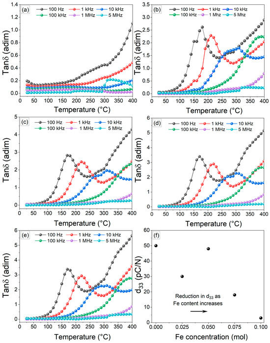 Temperature dependence of dielectric, tanδ, at different frequencies, from 100 Hz to 5 MHz, of pellets obtained from mixtures of Bi2O3, Fe2O3, Na2CO3, and TiO2 milled for 5 h and sintered at 900 °C for obtaining Bi0.5Na0.5Ti1−xFexO3−0.5x, with x values as follow: (a) x = 0, (b) x = 0.025, (c) x = 0.05, (d) x= 0.075 (e) x = 0.01, and (f) piezoelectric constant (d33) of Bi0.5Na0.5Ti1−xFexO3−0.5x samples with different iron concentrations (x = 0, 0.025, 0.05, 0.075, and 0.1 mol).