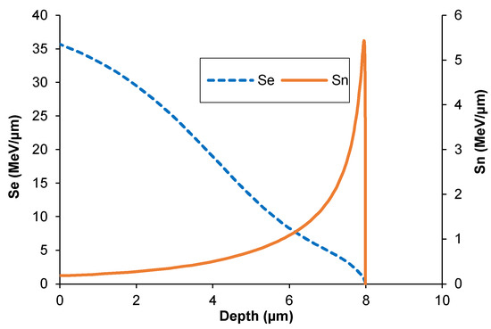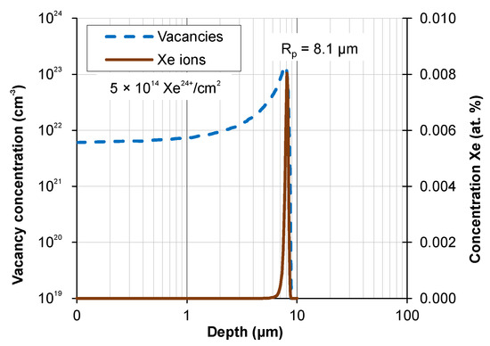 Theoretical calculations of the depth distribution of xenon ions and irradiation-induced defects were made using SRIM software (ver. SRIM 2013) [26]—Figure 1. The projected range Rp of xenon ions was 8.1 µm. It was assumed that the distribution of radiation defects was reflected by the distribution of vacancies produced during irradiation. The energy required to produce vacancies comes from the energy introduced into the target by xenon ions. Xenon ions were stopped due to the inelastic collisions with the target electrons (Se) and the elastic collisions with the nuclei of the target atoms (Sn). The magnitude of energy transferred into the target during the electronic (Se) and nuclear (Sn) stopping of xenon ions is shown in Figure 2.