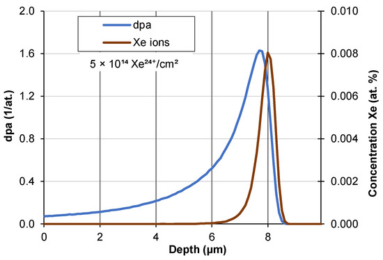The interaction of ions with the target is conveniently described by means of displacement per atom (dpa) units which contain information about the ion fluence and energy as well as the binding energy of the atoms in the target. The dpa number specifies the number of possible displacements of a single atom during bombardment of the target—Figure 3. It does not take into account defect annealing and radiation-accelerated diffusion occurring at room temperature [27,28].