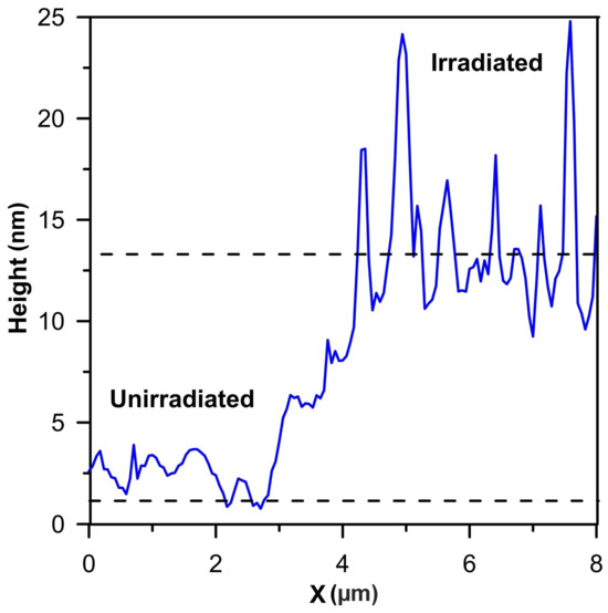Irradiation also causes swelling of the sample. The increase in sample thickness is the result of a lattice constant effect, an increase in the number of lattice sites due to diffusion of displaced bulk atoms to the surface and a reduction due to sputtering. After irradiation with xenon ions of 160 MeV energy with a fluence of 5 × 1014 Xe24+/cm2 (1.6 dpa) at T ≤ 60 °C, the swelling height of AISI 316 steel is about 13 nm—Figure 4. In the work [31] AISI 316L steel irradiated at T 350° C with ions of 5 MeV energy with a fluence of 2.6 × 1015 ions/cm2 (3.7 dpa) had a swelling height of 11 nm. The swelling of AISI 316 steel, despite the high dpa = 3.7, is less than expected due to thermal annealing of some of the defects during irradiation. There is no linear relationship between dpa and the amount of swelling in the sample. Qualitatively, this can be explained within the framework of the multistep damage accumulation model [32,33,34]. In addition, ion-induced annealing may occur [35].
