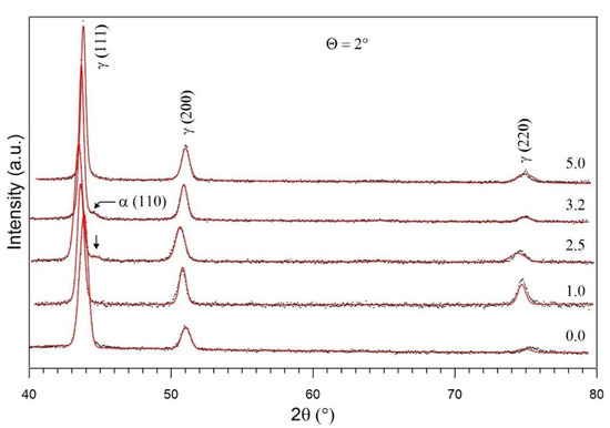 Prior to the irradiation of the unannealed sample, a pure austenitic structure (γ) is visible—Figure 6. Characteristic peaks corresponding to the martensitic phase γ (111), γ (200) and γ (220) can be seen, indicating its presence in the irradiated structure. The noticeable changes in peak intensity at different incident angles may suggest some variation in defect distribution and phase transformation as a function of depth. In contrast, the irradiation process of unannealed samples performed with the fluences 2.5 × 1014 Xe24+/cm2 and 3.2 × 1014 Xe24+/cm2, which results in the formation of martensite (α) amounting to about 1.5%. The formation of martensite was observed in a study [36] where the specimens were subjected to solution treatment at 1050 °C for 6 min followed by the water cooling to room temperature. A study [37] also described the transformation of original austenite into martensite in AISI 316L steel subjected to severe shot peening (SSP). There is no martensitic phase in the unheated steel unirradiated and irradiated with a minimum fluence of 1.0 × 1014 Xe24+/cm2. This phase is also absent in the heated steel after irradiation with a maximum fluence of 5.0 × 1014 Xe24+/cm2—Figure 6. This means that the transformation of part of the austenitic phase into a martensitic phase occurs after irradiation with 2.5–3.2 × 1014 Xe24+/cm2 and does not depend on the thermal treatment of the sample before irradiation.