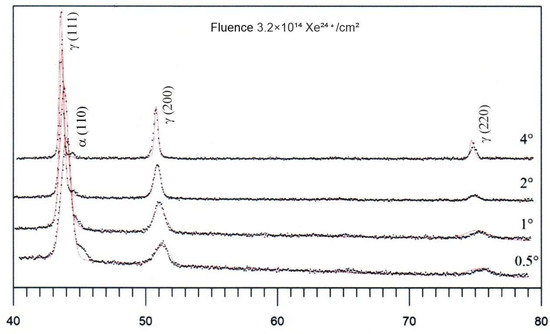 After irradiation of the unannealed samples with a fluence of 3.2 × 10¹⁴ Xe²⁴⁺/cm², X-ray diffractograms measured at different incident angles (0.5°, 1°, 2° and 4°) show the presence of a martensitic phase throughout the irradiated layer of AISI 316 steel—Figure 7. Characteristic peaks corresponding to the martensitic phase γ (111), γ (200) and γ (220) can be seen, indicating its presence in the irradiated structure. The noticeable changes in peak intensity at different incident angles may suggest some variation in defect distribution and phase transformation as a function of depth.