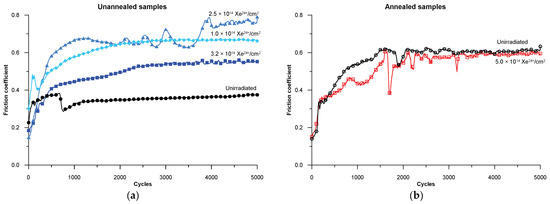 The results of the coefficient of friction from the tribological tests are shown in Figure 8. The lowest coefficient of friction was obtained for the unannealed and unirradiated steel samples, i.e., those with only defects formed during standard sample preparation—cutting, grinding and polishing. The coefficient of friction for the unannealed and unirradiated samples becomes stable at 0.35 above 2000 measurement cycles. Following irradiation with fluences of 1, 2.5 and 3.2 (×1014 Xe24+/cm2), there is a significant increase in the coefficient of friction value. The changes are fluctuating and depend on the irradiation dose. The largest fluctuations in the coefficient of friction during the tribological test are observed for the steel irradiated with a fluence of 2.5 × 1014 Xe24+/cm2. Irradiation with this fluence value maximally increases the lattice constant in all the tested layers (at different depths)—Table 3. The observed increase in the coefficient of friction for the AISI 316 steel specimens irradiated with high-energy xenon ions is similar to the exposure to the same Xe ion radiation of 100Cr6 bearing steel [20]. The increase in the coefficient of friction of the irradiated samples is often attributed to an increase in stresses in the surface layer and increased surface roughness caused by the impact of large and fast xenon particles.