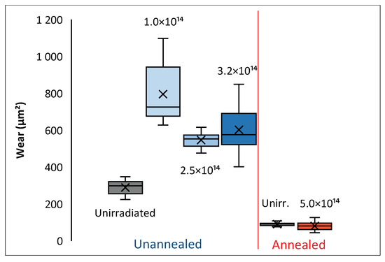 After a 5000-cycle tribological test, profilometric measurements of the wear track on the sample were conducted, and based on these measurements, the average wear for each sample was determined. The results are presented in Figure 9. The lowest wear is obtained for the unirradiated AISI 316 samples after annealing. The use of irradiation does not change the degree of wear of the annealed samples, just as it did not change the coefficient of friction above 2000 measurement cycles—Figure 8a.