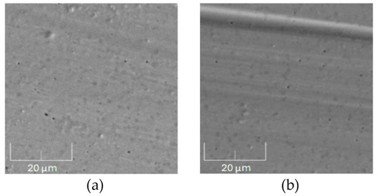 SEM images of the wear track on a 100Cr6 countersample after tribological tests conducted on annealed the AISI 316 samples: (a) unirradiated and (b) irradiated with a fluence of 5 × 1014 Xe24+/cm2. Magnification: 5000×.