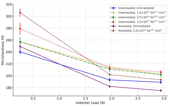 At the highest applied indenter load (2.94 N), the indenter was observed to penetrate to a depth of 10.5–10.6 um for unirradiated samples that had been irradiated with Xe ions. The irradiated and previously annealed sample showed a depression of approximately 10.8 um. These are above the original range of Xe ions. Changes in microhardness at a depth of 10 µm are less pronounced, indicating that the effect of irradiation on the deeper layers of the material is limited and may be due to the influence of the surface layer during microhardness measurement. A similar increase in the nanohardness of 2 MeV proton-irradiated AISI 316 steel was also observed in [13] at a depth greater than the implanted ion range calculated with the SRIM package [26].