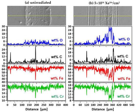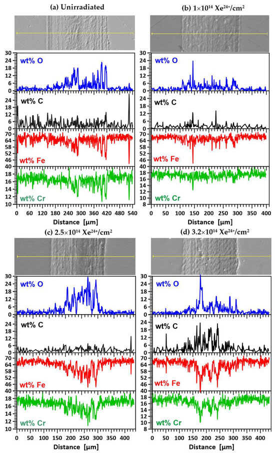 Figure 14a–d show SEM images of the wear track on the unannealed samples during the tribological test and the results of oxygen (O), carbon (C), iron (Fe) and chromium (Cr) measurements along the wear track. For the unirradiated specimens (Figure 14a) and those irradiated with doses of 1 × 1014 Xe24+/cm2 (Figure 14b) and 2.5 × 1014 Xe24+/cm2 (Figure 14c), the wear mechanism did not change significantly compared to the unirradiated specimen. EDX analysis showed no significant differences in the elemental content of the wear trace. Wear was still of an oxidative, abrasive and adhesive nature, as in the unimplanted sample.