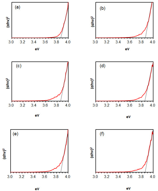 As shown in Table 2, Eg values were determined to be 3.85–3.87 eV (a–f), regardless of the reaction temperature of the SnO2 solution, or the sintering temperature. These relatively large values are consistent with previously reported data and are attributed to the quantum confinement effect observed in single-nanometer-scale crystals [31]. In a previous study, Matysiak et al. also highlighted that changes in the band gaps of SnO2 nanoparticles are influenced by the synthesis method, including sol–gel, spray pyrolysis, hydrothermal, thermal evaporation, and electrospinning techniques. They demonstrated that nanoparticles produced via electrospinning exhibited an increased band gap (~3.9 eV) due to a pronounced quantum confinement effect. In contrast, such increases in band gap have been predominantly reported for high-temperature synthesis methods, such as hydrothermal processes and calcination. Notably, our study shows that the slow hydrolysis process employed for the synthesis of SnO2 nanoparticles induces quantum confinement effects even at relatively low temperatures, as low as 100 °C.
