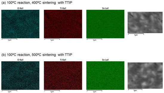 The effect of an additional TTIP layer on the SnO2 underlayer during the sintering process was also examined. Notably, the band gap narrowed to 3.53–3.60 eV at both reaction temperatures of 100 °C and 110 °C. The band gap of TiO2 is known to range between 3.0 and 3.2 eV, which is smaller than that of SnO2. The formation of a SnO2/TiO2 solid solution may be responsible for the reduced band gap in the double-layered substrates [32]. We obtained the EDX elemental mappings for the four samples, as shown in Figure 10. The analysis clearly indicates a uniform distribution of Ti ions, suggesting the formation of SnO2/TiO2 solid solution.