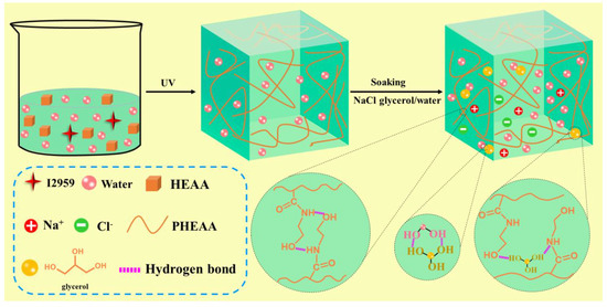 Figure 1 shows the preparation process of the PHEAA–Gl–NaCl hydrogel. First, Irgacure 2959 and HEAA were added to deionized water and the mixture was heated to 60 °C for 1 h to form a homogeneous solution. Then, the above solution was exposed to UV light for 3 h to initiate the polymerization of a HEAA monomer to obtain a PHEAA hydrogel. In the PHEAA hydrogel, the gel network was formed via hydrogen bonding among the PHEAA chains [36]. Subsequently, the PHEAA hydrogel was soaked in a saturated NaCl solution of glycerol/water (1:1, w/w) for 2 h to produce the PHEAA–Gl–NaCl hydrogel. In the preparation process of the PHEAA–Gl–NaCl hydrogel, no chemical crosslinkers were added, so the PHEAA–Gl–NaCl hydrogel was fully physically crosslinked.