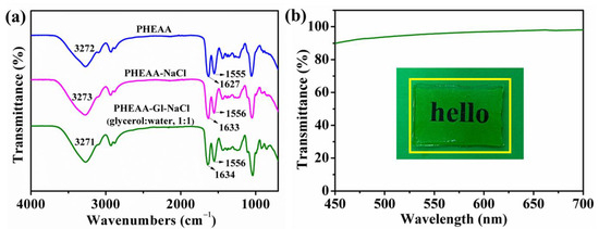 The structure of the PHEAA–Gl–NaCl hydrogel was analyzed via FT-IR spectroscopy (Figure 2a). In the spectrum of the PHEAA hydrogel, the band at 3272 cm−1 belonged to O–H and N–H stretching vibrations. The peak at 1627 cm−1 belonged to C=O stretching vibration, and the peak at 1555 cm−1 belonged to N–H bending vibration [36]. In the spectrum of the PHEAA–NaCl hydrogel, the band at 3273 cm−1 belonged to the stretching vibration of O−H and N−H, and the peak at 1633 cm−1 belonged to the stretching vibration of C=O. Compared with the PHEAA–NaCl hydrogel, a slight shift was observed in the stretching vibration of O−H and N−H (from 3273 cm−1 to 3271 cm−1) and C=O (from 1633 cm−1 to 1634 cm−1). Compared with the PHEAA hydrogel, no new absorption band appeared in the PHEAA–NaCl and PHEAA–Gl–NaCl hydrogels, confirming that no chemical reactions occurred. Moreover, the PHEAA–Gl–NaCl hydrogel had excellent transparency, and the word “hello” under the PHEAA–Gl–NaCl hydrogel could be clearly observed by the naked eye. The transmittance value was around 93% at a 500 nm wavelength (Figure 2b).