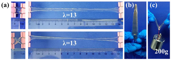 The mechanical properties of the PHEAA–Gl–NaCl hydrogel were explored to determine its applicability as a flexible device. As shown in Figure 3, the PHEAA–Gl–NaCl hydrogel could be easily stretched to 13 times its original length. It did not break, even in a distorted state. Meanwhile, the PHEAA–Gl–NaCl hydrogel had good toughness to resist the puncture and was able to withstand a load of 200 g. The above result preliminarily confirmed the good mechanical properties of the PHEAA–Gl–NaCl hydrogel.