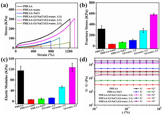 Moreover, strain–sweep was also carried out to study the rheological behavior of the hydrogels. As shown in Figure 4d, all of the hydrogels displayed strain-dependent viscoelastic behavior. In the linear viscoelasticity region (0.01–1%), the storage modulus (G′) was always greater than the loss modulus (G″), indicating that the hydrogels had elastic, solid-like behavior [37,38]. Meanwhile, the G′ of the PHEAA–Gl–NaCl hydrogel (Gl–water, 2:1) was the largest, followed by the PHEAA–Gl–NaCl (Gl–water, 1:1), PHEAA–Gl–NaCl (Gl–water, 1:2), PHEAA–NaCl, and PHEAA gels. The results also confirmed that the crosslink density of the PHEAA–Gl–NaCl hydrogel (Gl–water, 2:1) was the largest, followed by the PHEAA–Gl–NaCl (Gl–water, 1:1), PHEAA–Gl–NaCl (Gl–water, 1:2), PHEAA–NaCl, and PHEAA–water hydrogels.