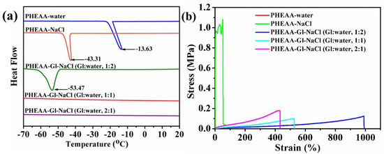 (a) DSC and (b) tensile curves at −40 °C for different hydrogels.
