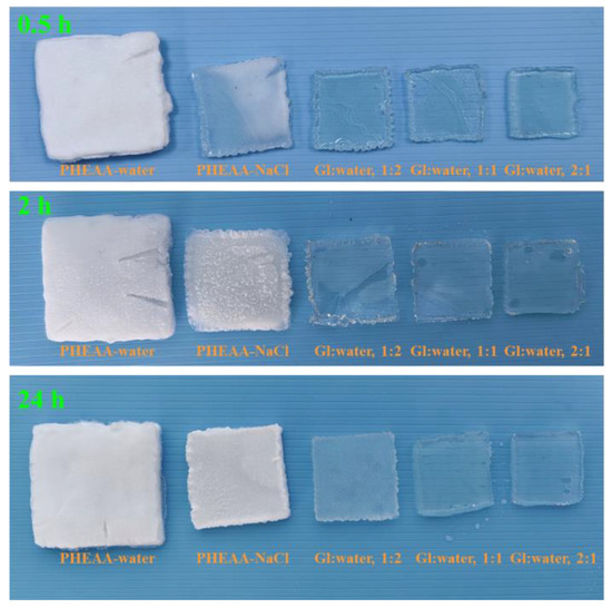 Moreover, photographs of the hydrogels at −40 °C are shown in Figure 6. Compared with the original transparent state (Figure S5), the PHEAA–water hydrogel become completely white after 0.5 h at −40 °C, indicating that the water in the hydrogel had frozen. Compared with the PHEAA–water hydrogel, the PHEAA–NaCl hydrogel only showed partial whitening for 0.5 h, indicating that sodium chloride gave the PHEAA–NaCl hydrogel an anti-freezing property to a certain extent. Compared with the PHEAA–water and PHEAA–NaCl hydrogels, all of the PHEAA–Gl–NaCl hydrogels were transparent at −40 °C for 24 h, indicating that the PHEAA–Gl–NaCl hydrogels had excellent anti-freezing properties because of the presence of glycerol. In our previous work, a PHEAA–Gl–LiCl hydrogel was prepared by the one-pot method. However, owing to the limited, relatively low glycerol content, the PHEAA–Gl–LiCl hydrogel could only resist freezing for 2 h at −40 °C [36]. Compared with the PHEAA–Gl–LiCl hydrogel, the PHEAA–Gl–NaCl hydrogel obtained by the immersion method possessed clearly better anti-freezing abilities.