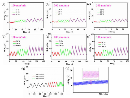 Relative resistance variations of PHEAA–Gl–NaCl hydrogel (a–f) at different rates and strains, (g) at different rates under cyclic 40% tensile strain, and (h) under cyclic 40% tensile strain for 300 cycles.