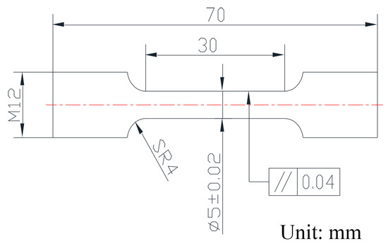 The metallographic microstructure was observed by an optical microscope (OM) with the model Axio Observer A1 Zeiss, supplied by Carl Zeiss AG, Oberkochen, Germany. The samples were etched in FeCl3-HCl (30%) solution, which was eroded for 15~20 min. SEM with the models TESCAN MIRA LMS (supplied by TESCAN, Brno, Czech Republic) and ThermoFisher Apreo were equipped with an EDS (energy dispersive spectrometer, supplied by Thermo Fisher Scientific, Waltham, MA, USA) to observe the fracture morphology and analyze the chemical composition. FEI Sirion 400NC SEM (supplied by FEI Company, Hillsboro, OR, USA) was used to collect EBSD data. The microstructure and crystal structure were characterized by Tecnai G2 F30 S-TWIN TEM (supplied by FEI Company, Hillsboro, OR, USA). The TEM accelerated voltage was 300 kV. TEM samples were prepared by a twin-jet polishing instrument with the model TJ100-SE-TMS (supplied by Jiangsu Leibo Scientific Instrument Co., Ltd., Wuxi, China). The electrolyte was a nitrate methanol solution with a volume ratio of 1:3. The temperature was −30 °C, the voltage was 12–13 V, and the electrolytic current was 26 mA. The CMT5305 electronic universal testing machine (supplied by MTS Systems Corporation in Shanghai, China) was used to test the mechanical properties of the alloy. The tensile samples were rod-like samples, the size of which is shown in Figure 1.