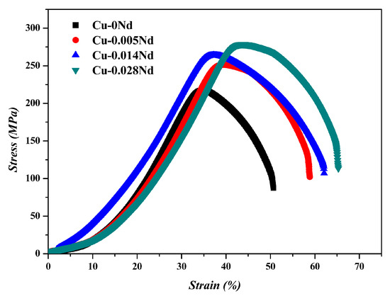 Tensile properties of Cu alloys with different Nd contents at room temperature.