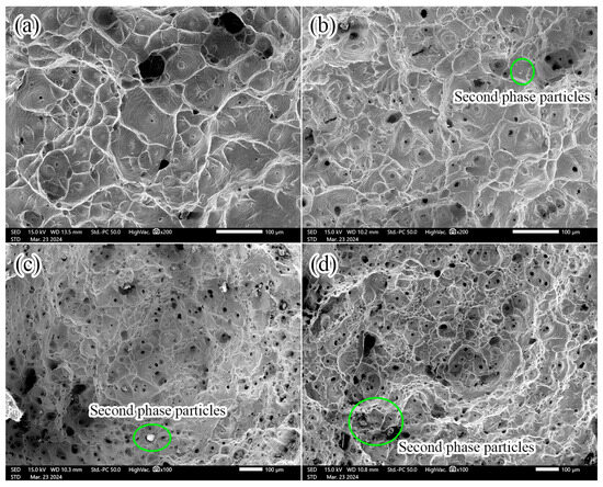 Fracture morphology of Cu alloys with different Nd contents: (a) sample 1; (b) sample 2; (c) sample 3; (d) sample 4.