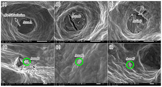 Fracture behavior of Cu-Nd inclusion in Cu alloys with different Nd contents: (a,d) sample 2; (b,e) sample 3; (c,f) sample 4.