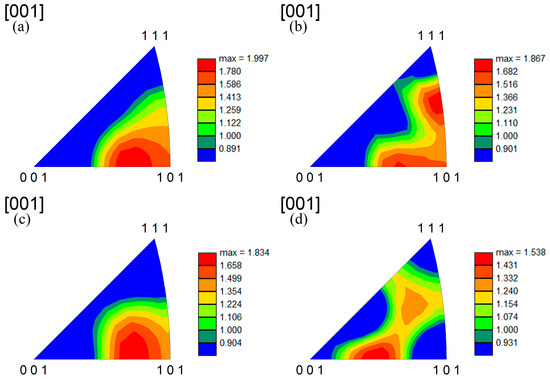 Inverse pole figure of Cu alloys with different Nd contents: (a) sample 1; (b) sample 2; (c) sample 3; (d) sample 4.