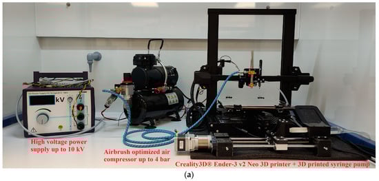 The overall cost of the setup is reasonable, with the high-voltage power supply being the most expensive component, and it is possible to design a low-cost option that could significantly reduce the total cost []. A direct comparison between this setup and industrial solutions presents challenges due to the reliance on price quotations rather than standardized pricing from manufacturers. Furthermore, performance comparisons are not suitable given the substantial differences in production quality and the advanced engineering involved in developing those systems. This setup is specifically designed for small-scale laboratory applications, providing researchers worldwide with a practical tool to initiate studies on new materials development using spray techniques. Designing a 3D printing system from scratch can be expensive, as it requires purchasing individual components. In contrast, pre-assembled printers are more affordable, thanks to manufacturers’ ability to source materials at reduced prices. Furthermore, choosing a commercially available 3D printer not only reduces costs, but also saves users the time and effort required in building, programming, and calibrating the system.