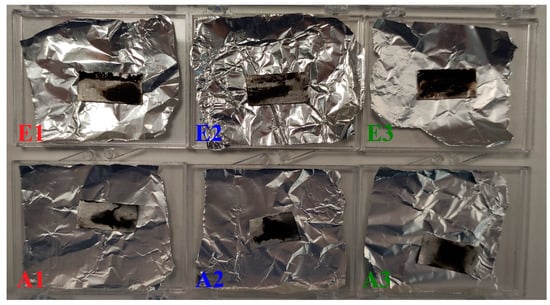 The six sprayed samples are displayed in Figure 4, where the top three samples (Electrospray 1—E1, Electrospray 2—E2, and Electrospray 3—E3) are from the electrospray method, and the bottom three samples (Air-Spray 1—A1, Air-Spray 2—A2, Air-Spray 3—A3) are from the air-assisted spray method. It is evident that all samples show poor coverage of the sprayed material on the surface. This poor coverage may be attributed to the properties of the solution, particularly its surface tension, as the solvent formed a large drop on the Al surface after the completion of each layer in both techniques []. To evaluate the repeatability of each technique, the mass of all substrates was measured with a precision scale before and after the deposition process. The air-assisted spray samples consistently had a deposited mass close to 2 mg, whereas the electrospray samples showed varying results with deposited masses of around 5 mg (E1), 3 mg (E2), and 14 mg (E3). The large variations of the electrospray mass samples are most likely related to the high voltage power supply, since all the other parameters were the same and it was the only value fluctuating during the process, about ±0.4 kV, due to inherently poor voltage regulation.