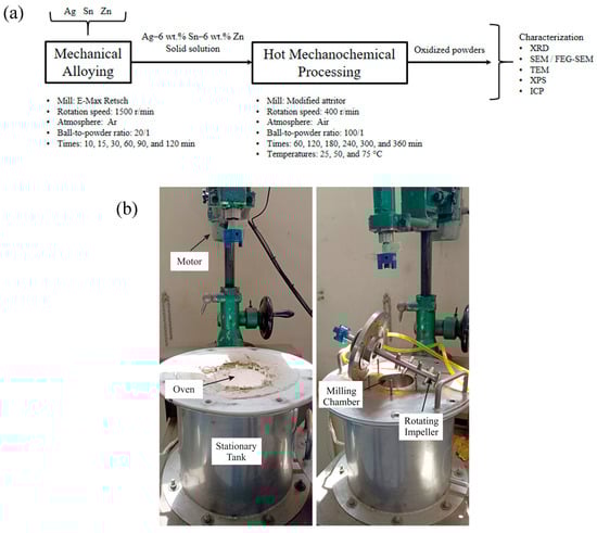 (a) Schematic flowchart of the experimental methodology and (b) photographs of the modified attritor.