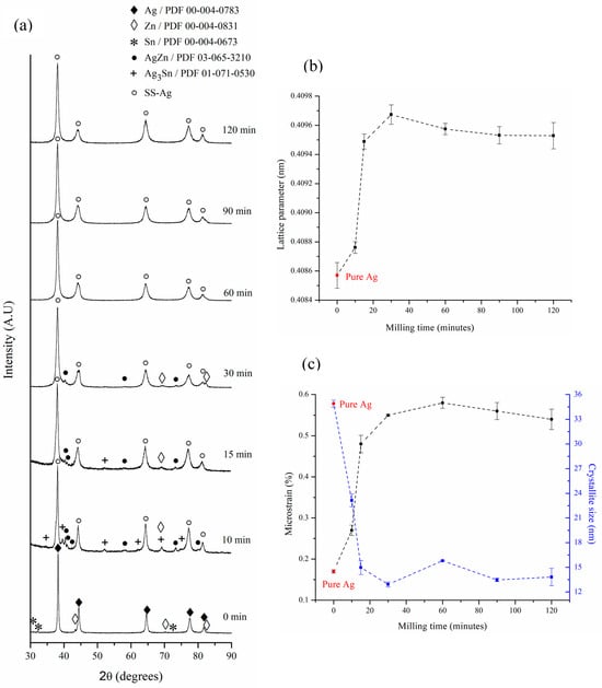 (a) XRD patterns of the powder at different mechanical alloying times; (b) lattice parameter; and (c) microstrain and crystallite size of SS-Ag (Ag-based solid solution) as a function of milling time.