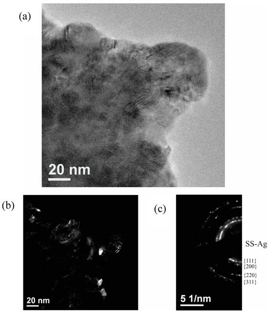 A TEM analysis was conducted to confirm the nanocrystalline structure of SS-Ag. Figure 3a shows a TEM image of the powders after 60 min of milling. Figure 3b provides a dark-field image with the corresponding electron diffraction pattern. Based on these results, it can be confirmed that the sample consists solely of nanocrystalline SS-Ag with an average crystallite size below 20 nm. No other phases were detected in the electron diffraction pattern, corroborating the XRD findings.