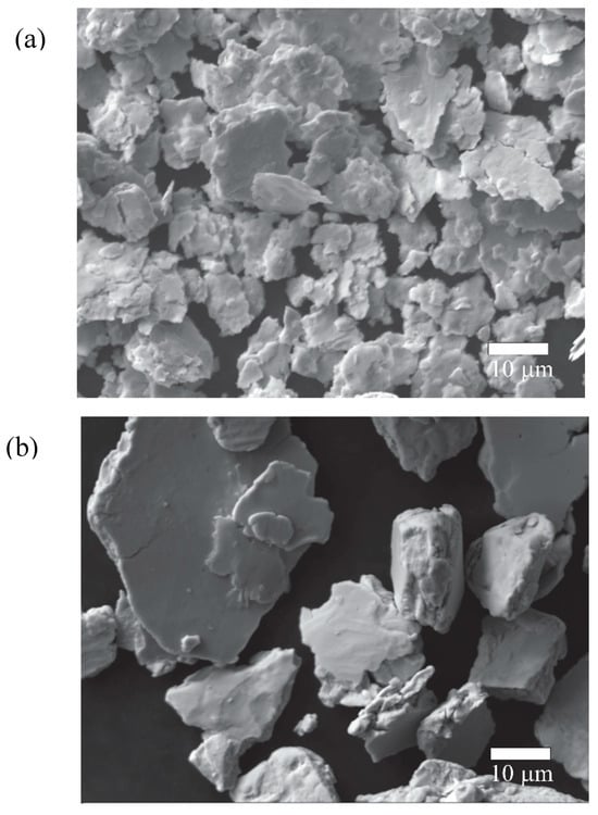Figure 4 illustrates the evolution of powder morphology throughout the mechanical alloying process. In the early stage of milling (Figure 4a), the powders consist of flattened agglomerates resulting from the ductile nature of Ag, Zn, and Sn. These metals undergo plastic deformation and cold welding due to the high energy imparted to the powder. At this stage, the agglomerates have an average diameter of 11.77 ± 2.18 µm, which is larger than the initial Ag powder particles. As the milling process progresses, the flat agglomerates undergo fracture due to the high levels of plastic deformation accumulated during milling. After 120 min of milling, the flattened particles cold weld together, forming larger, rounded agglomerates (Figure 4b) with an average particle size of 32.78 ± 8.04 µm.