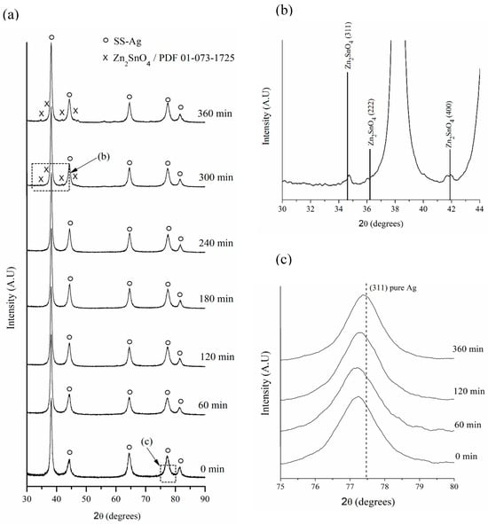 Figure 5a shows the powder XRD patterns of mechanically alloyed powders after 0, 60, 120, 180, 240, 300, and 360 min of hot mechanochemical processing at 75 °C. As can be seen in Figure 5b, which presents a broad area of the diffractogram of the powders milled for 300 min, it is possible to detect the presence of Zn2SnO4 by X-ray diffraction from 300 min of processing onward.