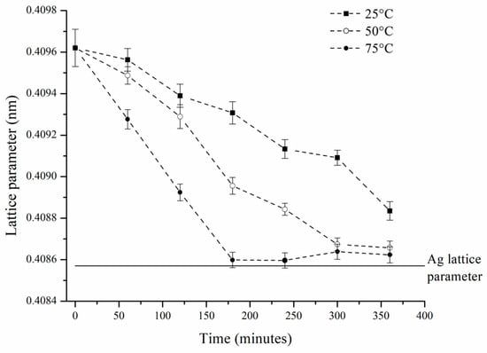 Additionally, it was observed that the peaks corresponding to SS-Ag gradually shifted toward higher 2θ angles (Figure 5c). This shift is attributed to the reduction in the lattice parameter of SS-Ag, caused by the loss of solute elements (Sn and Zn) due to oxidation during the hot mechanochemical process. The lattice parameter reduction continued until it approached a value close to that of pure Ag (Figure 6). It is important to highlight that all three sample sets processed at different temperatures exhibited similar behavior. However, it was evident that the rate of lattice parameter reduction increased with rising milling temperatures, suggesting that, as expected, the oxidation process is thermally activated when mechanically assisted.