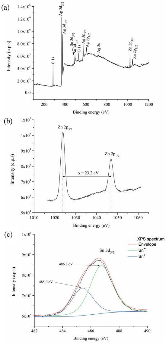 XPS results indicate that oxidation of both Zn and Sn occurred during the hot mechanochemical process of the Ag-based solid solution, corroborating the XRD findings which detected the presence of Zn2SnO4. The presence of elemental Sn and Zn oxides cannot be ruled out, as their size and quantity may be below the detection limits of X-ray diffraction. Additionally, the results suggest that a small proportion of unoxidized Sn may remain within the Ag-based solid solution. This can be attributed to the lower change in the Gibbs free energy during the formation of SnO2 compared to ZnO [41].
