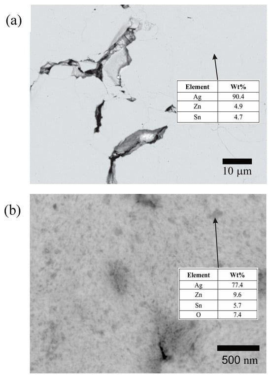 On the other hand, the cross-section micrograph from the powders mechanochemically processed for 360 min at 75 °C reveals the presence of oxide precipitates on a nanometric scale (dark gray points) uniformly distributed in the Ag-rich matrix (light gray zone) (Figure 8b). The EDS analysis of the dark gray points indicates a higher Zn, Sn, and O content than the solid solution produced by mechanical alloying. This corroborates the fact that the hot mechanochemical process promotes the preferential oxidation of Zn and Sn.