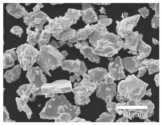 Regarding the particle size of the powders processed by hot mechanochemical processing, it was found that all samples exhibited particle sizes below 25 µm. As a representative example, Figure 9 shows the morphology of the powders after 360 min of hot mechanochemical processing at 75 °C. It can be observed that the particles are composed of small, irregular agglomerates with an average diameter of 7.5 ± 3.5 µm. The reduction in particle size compared to powders subjected to mechanical alloying can be explained by the formation of oxide precipitates during the hot reactive milling process, which increases the fragility of the powders and facilitates their fracture.