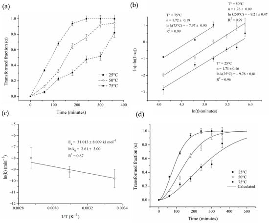 (a) Transformed fraction as a function of time for different temperatures, (b) linear adjustment using JMAK model, (c) Arrhenius plot of ln(k) against 1/T, and (d) comparison between experimental and calculated transformed fraction.