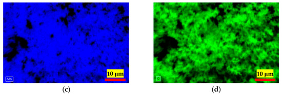 Elemental mapping by EDS analysis for Mn2O3 powder. (a) Multi-elemental distribution of Mn, Mg, and O elements; (b) Mg distribution; (c) Mn distribution; and (d) O distribution.