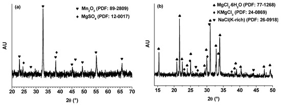 At the same time, the results obtained from the XRD analysis of the natural bischofite (MgCl2·6H2O) salt are presented in Figure 3b, in which a dissimilar peak appears at the 2θ angle close to 16.32°, corresponding to the crystalline plane with indices of (h, k, l) = 0, 0, 1 and showing a relative intensity of 100%. This peak serves as a clear indicator of the unique crystalline structure of bischofite. However, the natural bischofite has particular impurities such as K+ and Na+ from carnallite and halite salts present in the composition of well brine. The XRD analysis reveals crucial details about the crystalline arrangement of bischofite.