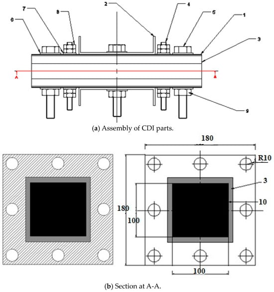 They were fabricated and assembled to design and manufacture the capacitive deionization (CDI) unit, illustrated in Figure 1 and Table 1.