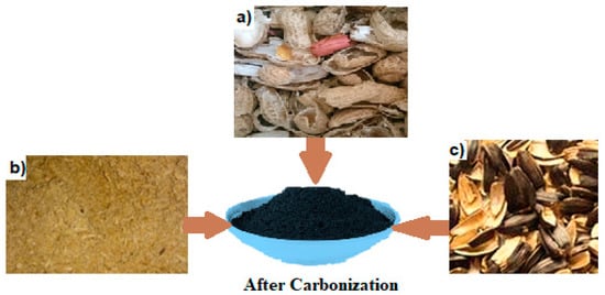 The shells of sunflower seeds, peanuts, and grains were all finely ground. The product was dried at 200 °C for 19 h. The final step involved grinding the material and loading it into quartz boats. Carbonization finally occurred after heating the furnace to 700 °C and maintaining it at this temperature for an hour with a constant flow of 18 dm3/min of argon. After undergoing pyrolysis, the samples were again milled down to ground level. The resulting pH was neutral when the powder was washed with distilled water. After soaking in 1 mol/dm3 concentrated hydrochloric acid for 19 h, the following procedures were carried out to neutralize the filtrate.
