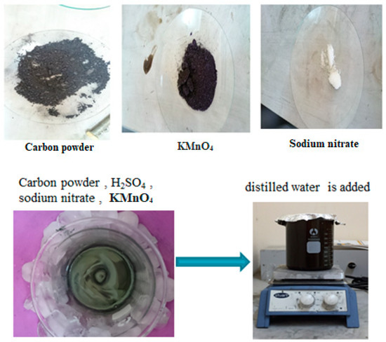 Five grams of carbon powder were combined with 140 mL of concentrated H2SO4, 15 g of sodium nitrate, and 3 g of potassium permanganate, which were added gradually while stirring for 90 min. Slowly, 230 mL of distilled water was incorporated, as illustrated in Figure 3.