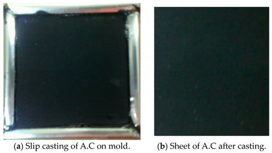 Activated carbon, a binder, and a conductive additive are added to the current collector before the electrode is produced by slip casting. Attaching the ACP to the current collector and giving it structural rigidity is the job of the polymeric (PVDF) binder. Binders, such as polyvinylidene fluoride (PVDF), are widely employed [32]. At 150 °C, activated carbon powder, ethyl acetate, and polyvinylidene fluoride (PVDF) are mixed and agitated. Since excessive binder could diminish the surface area by blocking access to pores, using the tiniest quantity necessary to give the electrode appropriate mechanical strength is standard practice. About 10% by weight (wt%) comprised PVDF [33]. Conductive binders and ACP are slurried together in a suitable solvent to form a slurry. The Figure shows that the casting or coating procedure in the mold dimension can affect the CDI electrode’s characteristics and properties. After casting, the electrode is dried at a high temperature, often in a vacuum, until the solvent completely evaporates [34]. We utilize carbon sheet drying at 120 °C for 2 h and vacuum oven drying at 80 °C for 2 h. For 24 h, we treat the product with a 1 M KOH solution, followed by drying at 70 °C in a vacuum for 6 h after being washed with deionized water until the pH is neutral [35], as shown in Figure 4 and Figure 5.