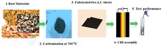 Subsequently, these substances were utilized to construct CDI electrodes, which were integrated into the configuration of CDI desalination systems, as shown in the experimental procedure outlined in Figure 2.