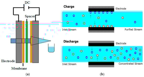 The applied voltage can be reduced or changed in polarity to cause the ions to be resorbed once the electrode surfaces are saturated with ions. Then, purified water and concentrated brine can be produced by switching between the adsorption (charge) and desorption (discharge) stages [39].