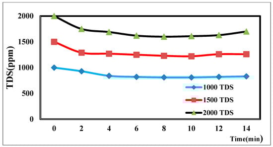 When we observe an increase in TDS, we change the electrode by changing the anode to the cathode and vice versa, which leads to the repulsion of ions deposited on the electrode. As Figure 14 shows a sharp and sudden increase in TDS for a while after that, we notice a slow decrease in grading; this shows the readiness of the electrode for a new desalination process. We also note that there is a relationship between low voltage [53] and TDS low voltage, giving us good regeneration.