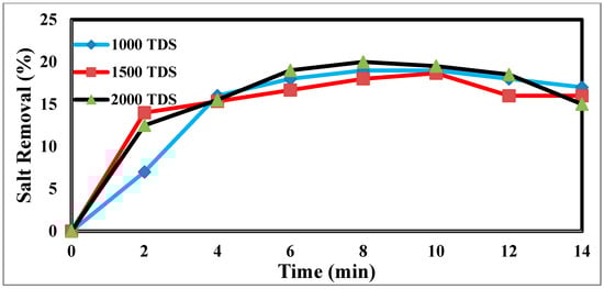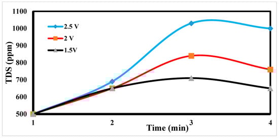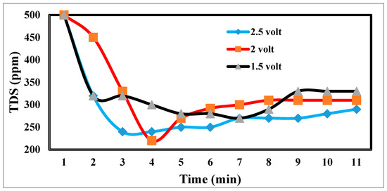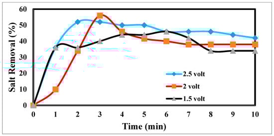 The desalination process is affected by potential electrode differences in CDI [47,48], as shown in Figure 12. It shows a sharp decrease in TDS at 2.5 and 2 volts, which appears to be the increase in volts that reduces TDS so fast [49]. Figure 13 indicates the relation between the removal % and time for ions. According to EDL theory, increasing the voltage applied to the CDI cell boosts the charge at the electrode–solution interface, promoting the salt adsorption capacity. The capacity for absorbing salt rises exponentially from 0.6 V to 1.2 V rather than linearly with applied voltage. The salt adsorption capacity, however, does not appreciably increase above 1.2 V, most likely because of parasitic electrochemical processes [50]. The standard reduction potential (SRP) for water electrolysis being at 1.23 V and data demonstrating that charge efficiency declines and specific energy consumption rise with increasing applied voltage support this. Different applied voltages have been reported to improve various desalination parameters, including salt adsorption capacity, charge efficiency, specific energy consumption, and electrosorption rate. Based on their findings, the authors of [51] asserted that 1.2 V, which is only marginally lower than the SRP for water electrolysis, is the ideal point.