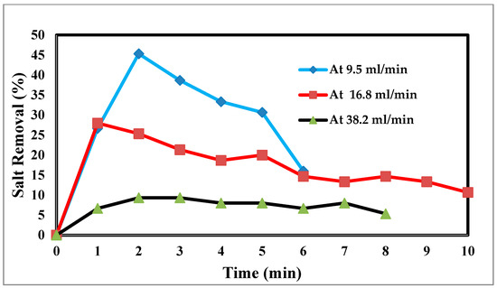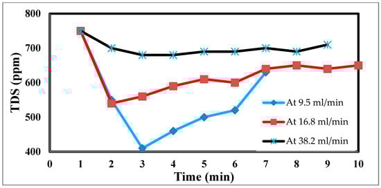 In an experimental setting, the flow rate is crucial, because it regulates how long the salt stays in contact with the electrodes. The effluent concentration is more filtered due to the saline water’s lengthier contact with the electrodes and increased salt removal effectiveness at low flow rates [45]. The relationship between the flow rate and energy consumption is inverse, although the flow rate also has positive relationships with the charge efficiency and salt adsorption capacity, as well as with both [46]. For the most efficient use of energy and salt removal, it is recommended that a pass CDI system with two sheets of activated carbon electrodes and electrode dimensions of 10 × 10 × 1 mm employ flow rates of 9.5, 16.8, and 38.2 mL/min. However, this optimal flow rate is 9.5 mL/min because of flow rate changes. Retention time, or the time that the saline water is in contact with the electrode, has thus been advocated as a potential operating factor in place of the flow rate. The flow rate input through CDI has an impact on the desalination process. The relationship between the feed flow rate velocity and feed TDS decrease is shown in Figure 10 at 9.5 mL/min, corresponding to a sharp TDS decrease. This demonstrates the direct correlation when 38.2 mL/min exhibits a tiny reduction, which informs us that a low flow rate allows time for ions to be drawn to the anode and cathode. The relationship between the removal percentage and time for ions is shown in Figure 10 and Figure 11.